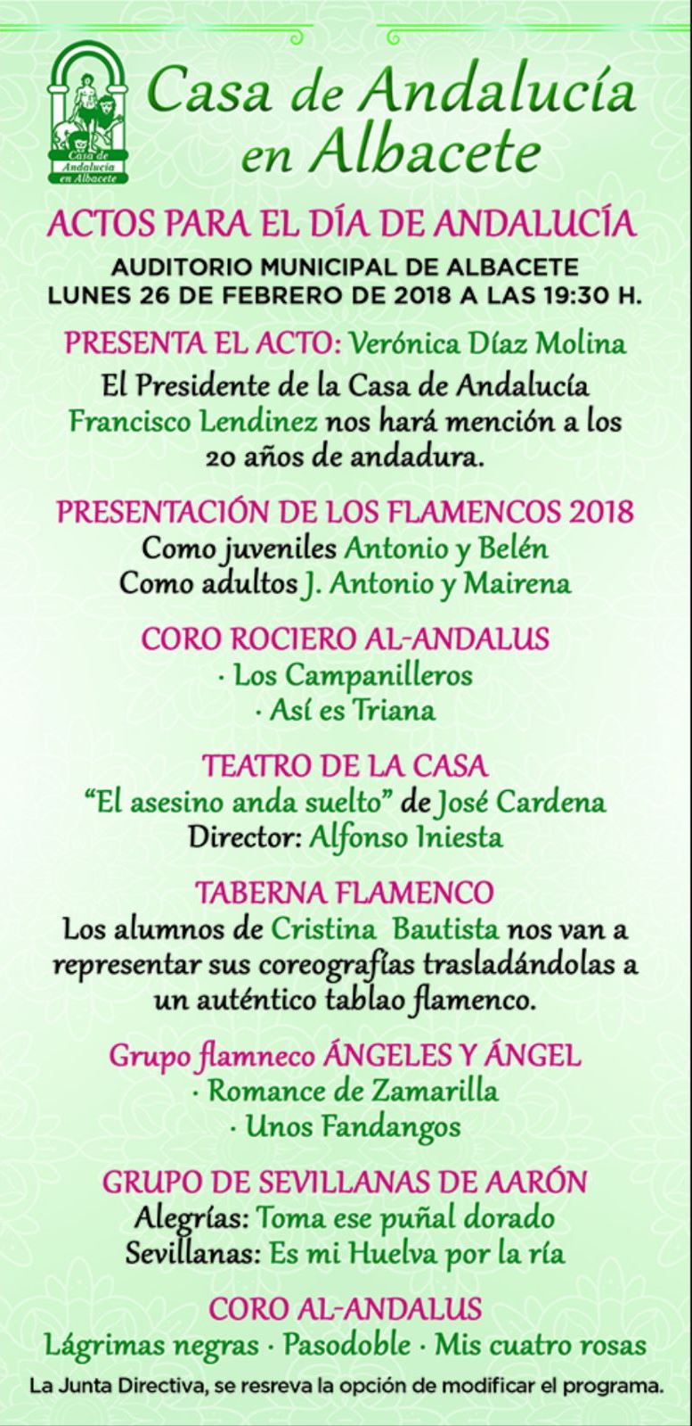 Aquí os presentamos los diferentes actos de la Semana Cultural y Día de Andalucía que celebraremos entre los días 24 y 28 de febrero de 2018. Esperamos que sea de vuestro agrado.
